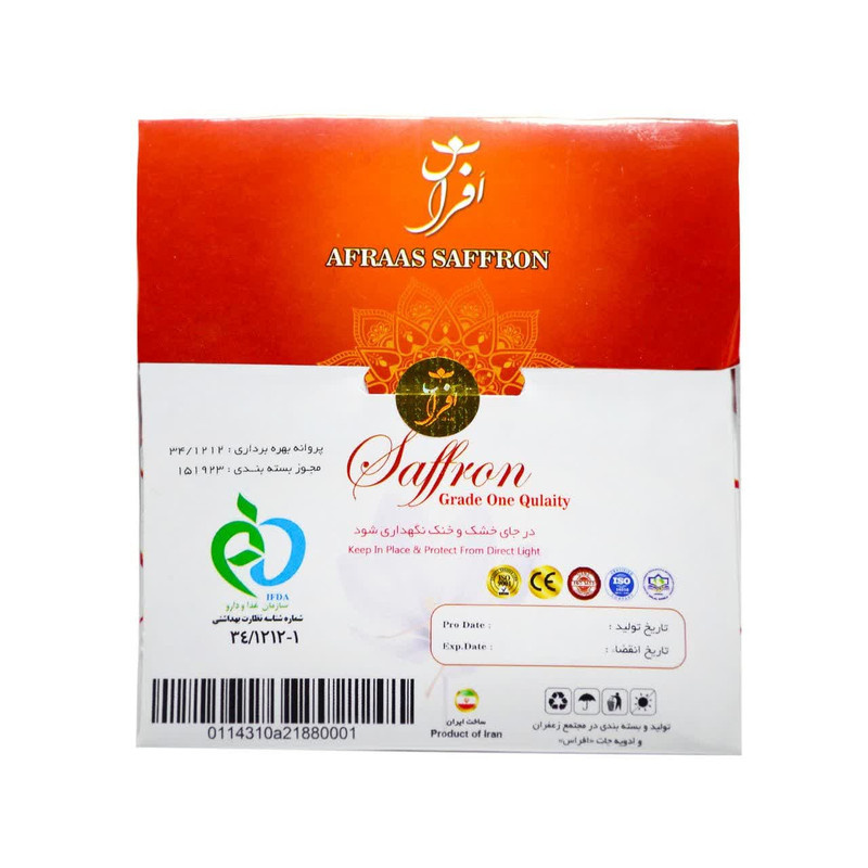 همراه با استند کاغذی و بند مخصوص برند افراس زعفران یکی از بهترین چاشنی های بسیار پرخاصیت و مفید برای رنگ دهندهی و خوش عطر کردن غذا و یکی از محبوبترین و شناختهترین محصولات ایران است که شهرتی جهانی دارد. زعفران درجه یک افراس یکی از همین چاشنیهای خوشرنگ و لعاب است که بهصورت رشتهای و در وزن 4.608 گرم در بستهبندی مناسب آمادهی ارائه به شما مشتریان عزیز است. این محصول باقیمت مناسبی در بستهبندی به ابعاد 12x11 سانتیمتر آمادهی ارائه است. همانطور که میدانید زعفران علاوه بر رنگ و طعم مطبوعش خواص بسیار گوناگونی هم دارد که میتوان به برخی از آنها اشاره کرد. از این گیاه میتوان برای افسردگی ، جلوگیری از اسپاسم های متعدد استفاده کرد. زعفران یک گزینهی مناسب و پیشگیریکننده از بیماریهای قلبی و سرطان بوده و باعث تقویت حافظه و کاهش فشارخون میشود. از گیاه زعفران در بیماری آسم، بیماریهای پوستی، بیماریهای چشم، عفونت ادراری، یرقان، رفع نفخ شکم ، معده درد و کمخونی استفاده میشود.