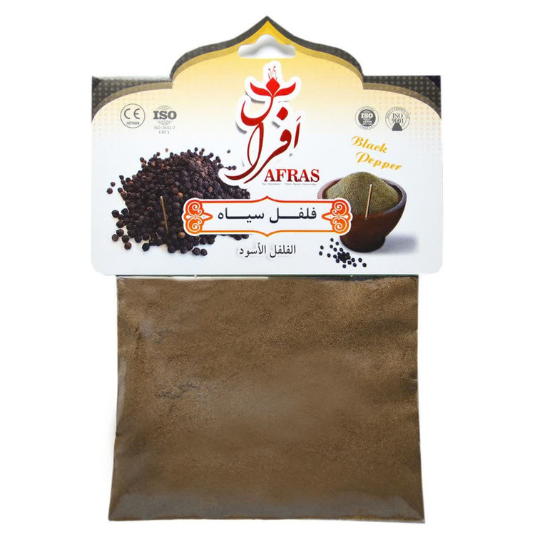 فلفل سیاه دوست همیشگی نمک است و همیشه نمکدانها به صورت جفت برای فلفل سیاه و نمک ساخته میشوند. از همین میتوان فهمید فلفل سیاه چقدر پرمصرف است. استفاده از فلفل سیاه در تهیه سوپ، مزه و عطر آن را تحت تاثیر قرار میدهد. فلفل سیاه بیشتر از اینکه تند باشد، به غذا عطر میدهد. «افراس» فلفل سیاه را به صورت پودردر اختیار مصرفکنندگان قرار داده است. با اضافه کردن پودر فلفل سیاه به غذا و سالاد، عطر مطبوع آن را به خوبی حس خواهید کرد. فلفل سیاه از ادویههای بسیار پرخاصیت است که آنتیاکسیدان موجود در آن مانع از آسیب رادیکالهای آزاد به سلول میشود.همچنین تسکین دهندهای عالی برای سرماخوردگی است. . تولید پودر فلفل افراس با دستگاههای اتوماتیک بوده و در محیط کاملا بهداشتی به عمل آورده میشوند.